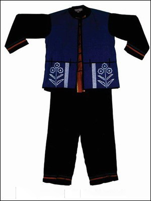 以前闽东畲族男子传统服饰为青黑或蓝色的大襟布衫,夏天穿用的大襟麻布衫,耐汗、耐磨、通风透气性能好,其款式为对襟、无领,用蓝布镶领口,两肩上衬有棉布“搭肩”。冬天畲族男子穿的大襟布衫,多用棉布缝制,故又称棉布衫。男婚礼服装是红顶黑缎官帽,类似清代官帽,青色或红色长衫,其襟、胸前绣花纹饰,外套龙凤马褂,长衫的襟口和胸前有一方绣有龙的花纹图案,脚案白色布袜,圆口黑面布底鞋。